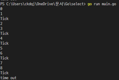 그러니까 <-time.After(10 * time.Second):를 했을 때 10초 뒤에 입력이 오는 채널을 반환 했는데