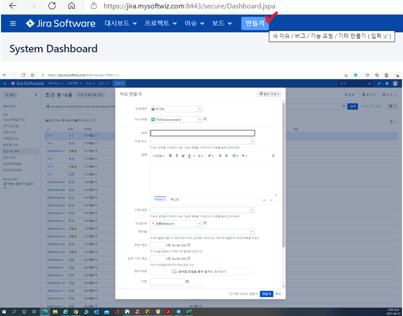 1)"만들기"탭을 통해 이슈 생성