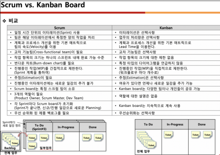 상당히 많은 개발회사는 스크럼을 쓰고, 유지보수를 주로 하는 회사는 칸반을 쓴다.