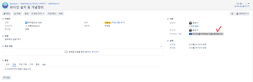 5) 지켜보기:이슈가 변경 되었을 때 자동으로 알림이 오는 기능 "이 이슈를 지켜보기 시작합니다" 클릭 시, 지켜보기 기능 on이 되고, "이 이슈를 지켜보는 것을 중단합니다"를 클릭 시, 지켜보기 off가 됨.