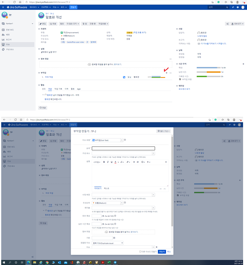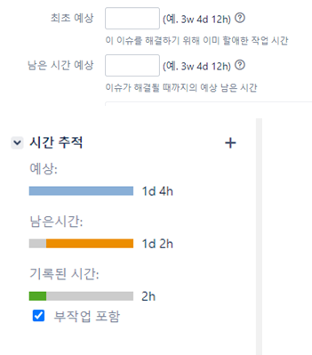 2)"이슈 생성"시에 "최초 예상" 및 "남은 시간 예상"에 값을 입력하면, 해당 이슈 조회시에 "남은 시간"을 traking 할 수 있음