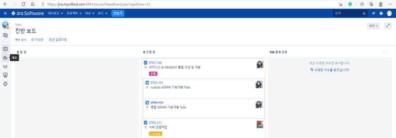 5. 아래 그림은 생성된 칸반(Kanban) 보드 화면임 칸반 보드는 "할 일"/"진행 중"/"완료" 이렇게 3개의 sector로 나뉘어져 있으며, 드래그&드롭을 통해 다른 sector로 이동이 가능함
