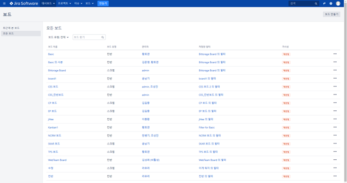 3. 전체 보드 목록 화면의 우측 상단에 "보드 만들기"클릭시 "스크럼 보드 만들기"와 "칸반 보드 만들기"중 하나를 선택할 수 있음