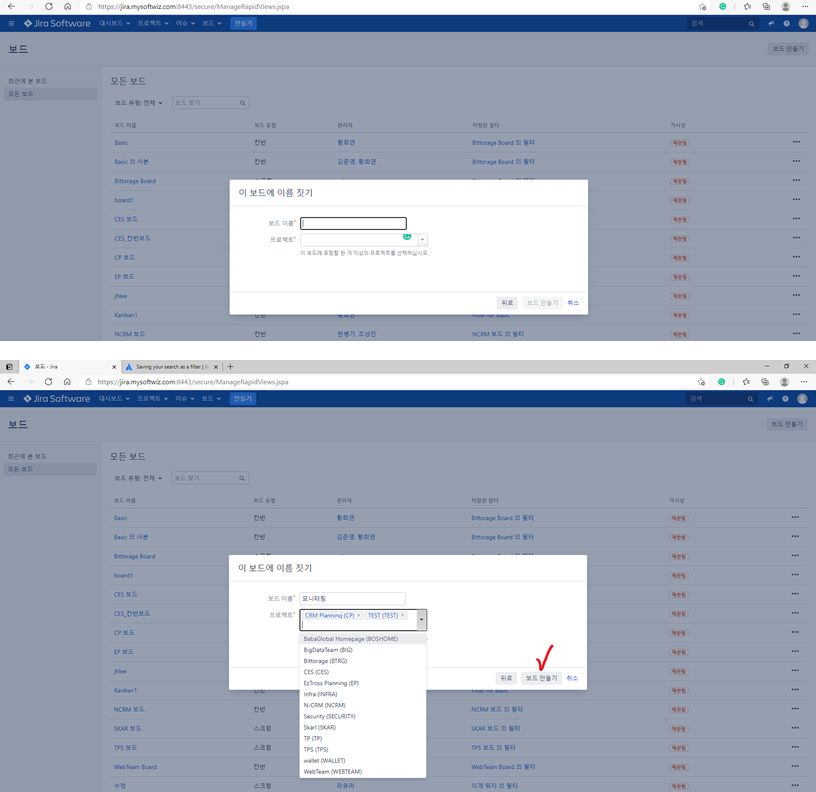 4. "스크럼 보드 만들기"와 "칸반 보드 만들기" 클릭시 공통적으로 "보드 이름", "프로젝트"를 선택하고, "보드 만들기"를 클릭하면 보드를 생성할 수 있음