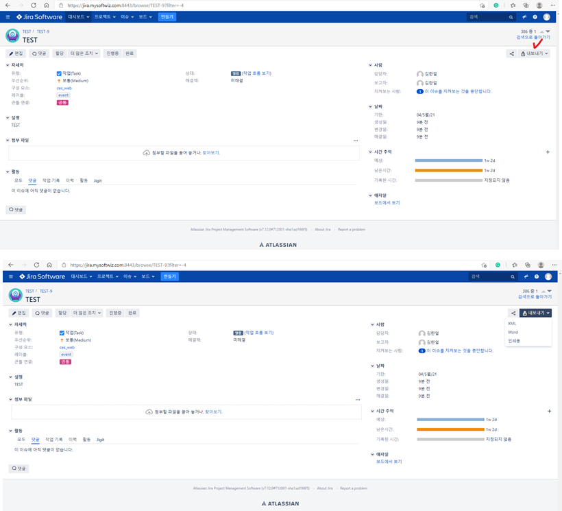 7) 특정 이슈 선택 후 우측 상단에 "내보내기" 클릭시, "XML/Word/인쇄용"을 선택 후 내보내기 할 수 있음