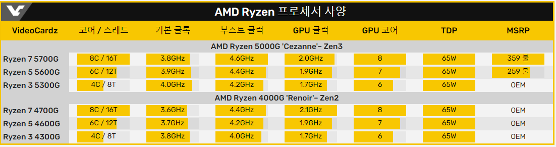그리고 다른 2종의 APU와 함께 OEM용 APU 라인업으로 소개된 라이젠 3 5300G(Ryzen 3 5300G)는 이번 데스크탑용 APU 라인업에는 포함되지 않았다고 합니다.