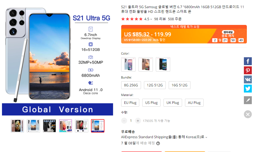 S21 울트라를 알리 익스프레스에서 14만원에 판매 한다고 하는 링크가 떴는데 이게 진품인지 모르겠네요ㅎㅎ