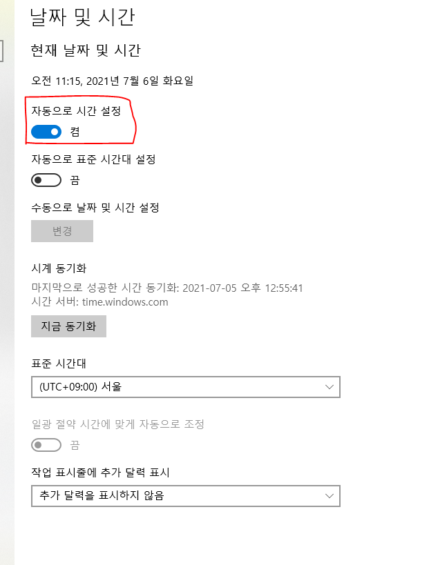 윈도우 10에서 특히 위와 같은 버그가 종종 발생 하는 편이기 때문에 윈도우의 날짜 동기화를 껐다 켜는 것으로 해결 할 수 있습니다.