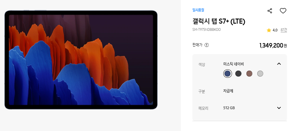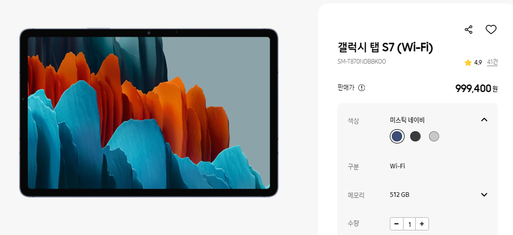 가격의 경우 갤럭시탭 S7의 모델은 66만원 부터 시작하고 있고 (Wi-Fi 128GB 모델)