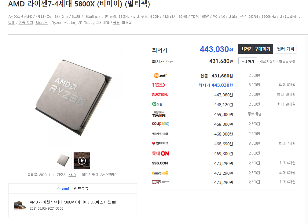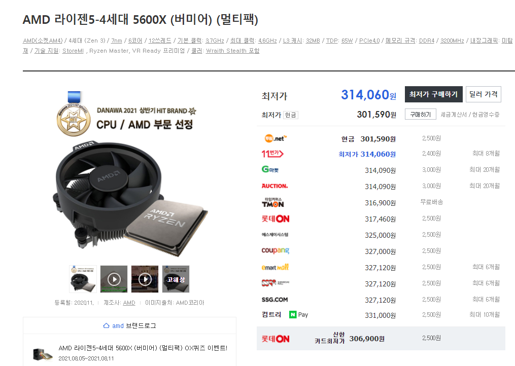 이 곳을 보면 5600X는 가격 변동 폭이 크게 없는데 특히 5900X가 상당히 변동의 폭이 커진 것을 알 수 있네요.