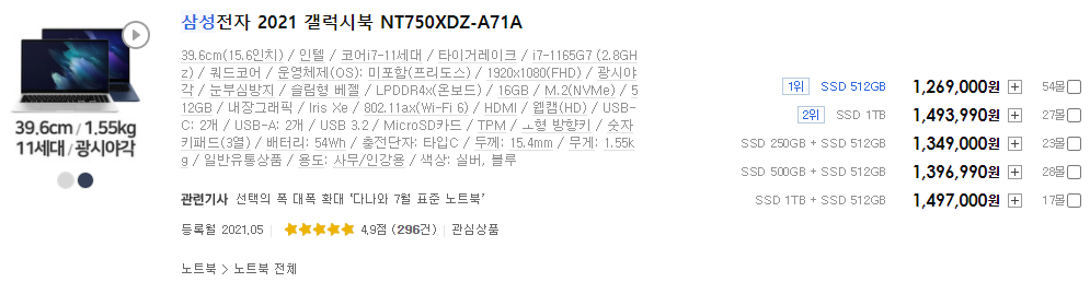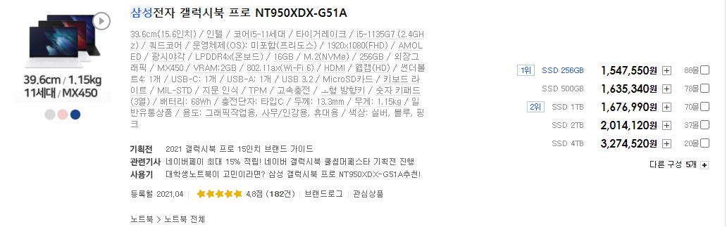 삼성의 경우 갤럭시북과 갤럭시북 프로가 있는데 둘 중 재정 상황에 맞는 것으로 사시면 되겠습니다.