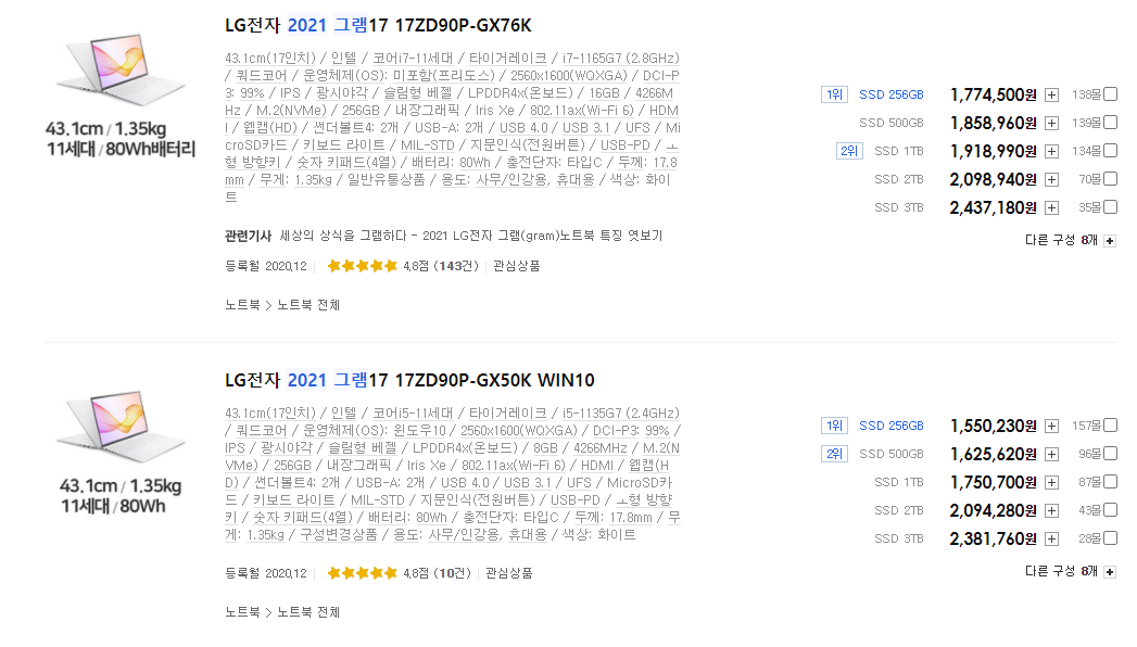 17인치 모델 중에선 이 모델을 추천드립니다. 17인치 이면서도 고해상도이기 때문에 코딩하시는 환경에선 최고라고 할 수 있습니다.