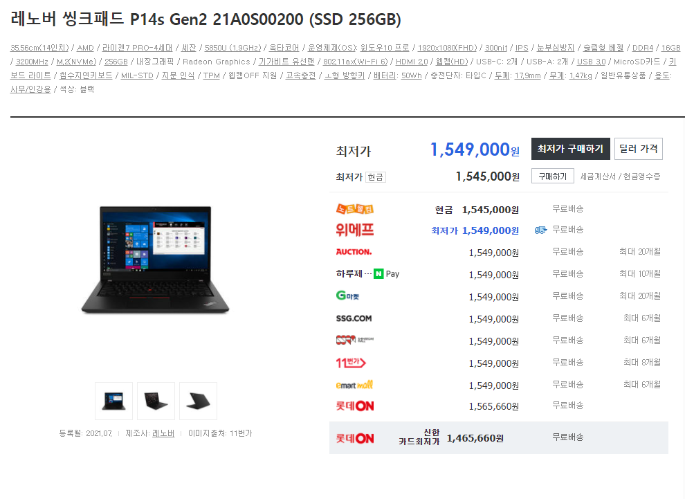 2. 해외 제품은 100만원 미만 - 씽크패드 E시리즈, 100만원 초반 - HP 엘리트북 855 G8 100 중반 - 씽크패드 T14