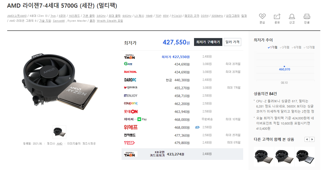 5300G는 아직 완본으로는 판매하고 있으나, 단품으로는 판매하고 있지 않네요! 5600, 5700G를 기다리셨던 분들 참고하시기 바랍니다!