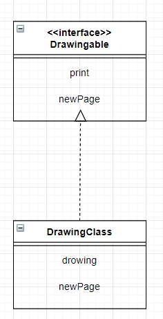 Drwingable이라는 인터페이스가 있고, DrawingClass라는 클래스가 Drwingable 인터페이스를 구현 하는 것으로 나타내고 있습니다.