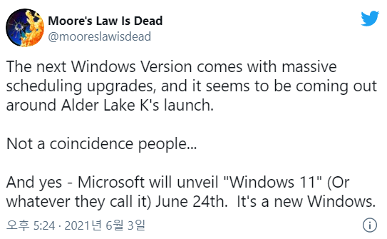 또한 인텔과 Microsoft는 대규모 예약 업그레이드를 가져올 Windows 운영체제의 향후 빌드를 위해 엘더 레이크 CPU 성능을 최적화하기 위해 긴밀히 협력하고 있으며 엘더 레이크 칩 출시와 동시에 출시될 예정입니다. 첫 공개는 6월 24일에 예정되어 있습니다.