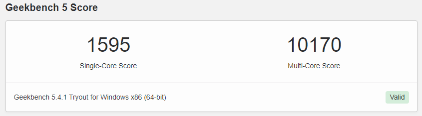 싱글코어 1595점을 기록하였으며, 이는 i5 11500, i7 11700F 정도에 멀티는 10170점, i9 11900KF, i9 9900X, Ryzen 7 5800X 정도의 점수를 보여주었습니다.