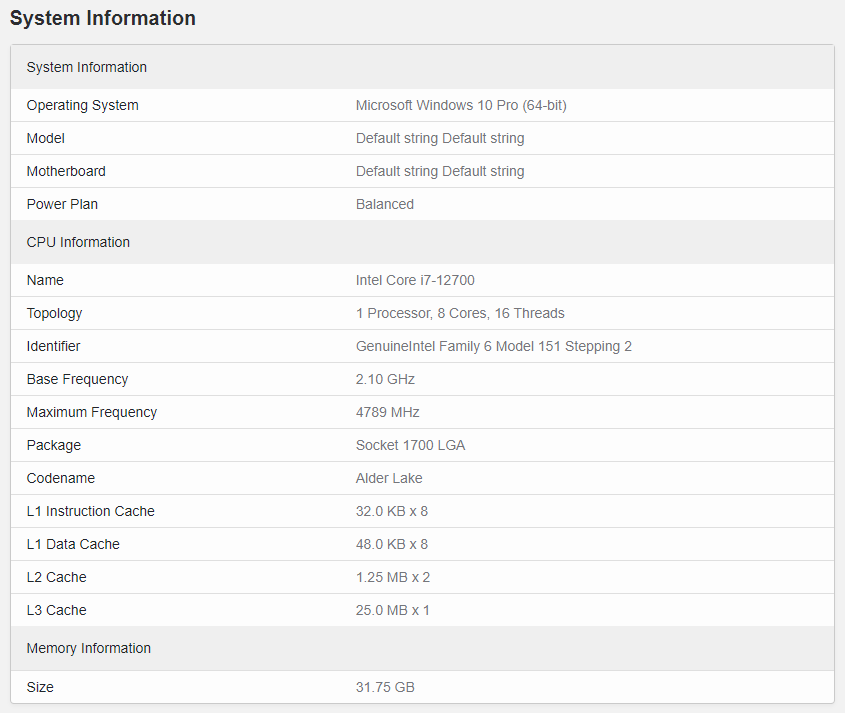 i7 12700K는 6+8의 14코어 20쓰레드로 알려져있으나, 이번 i7 12700 논-K 벤치마크에서는 8코어 16쓰레드라고 표기된 모습입니다. LGA1700 소켓과 4.8GHz의 부스트 클럭, 그리고 캐시등은 비교적 올바르게 인식된 모습입니다. 또한 이전 루머의 L3 25MB를 이번 벤치마크를 통해 확인할 수 있었습니다.