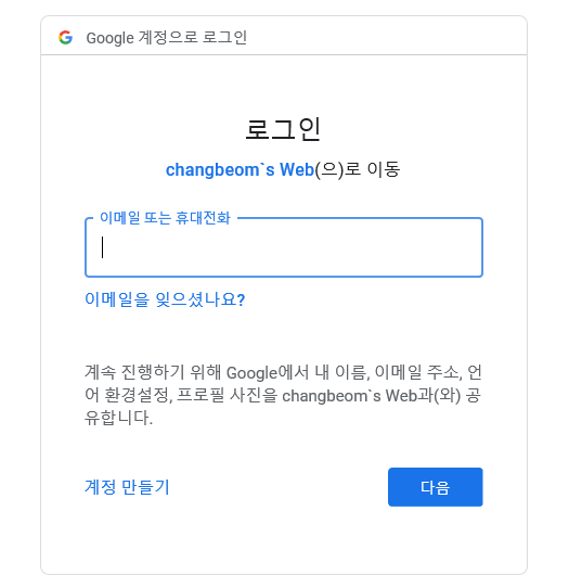 그 후 버튼을 구글 로그인 버튼을 클릭 후에 로그인을 하게 되면 아래와 같은 화면이 뜹니다.