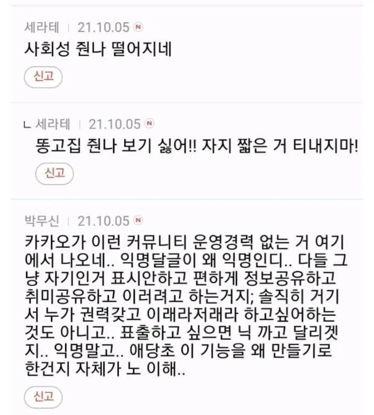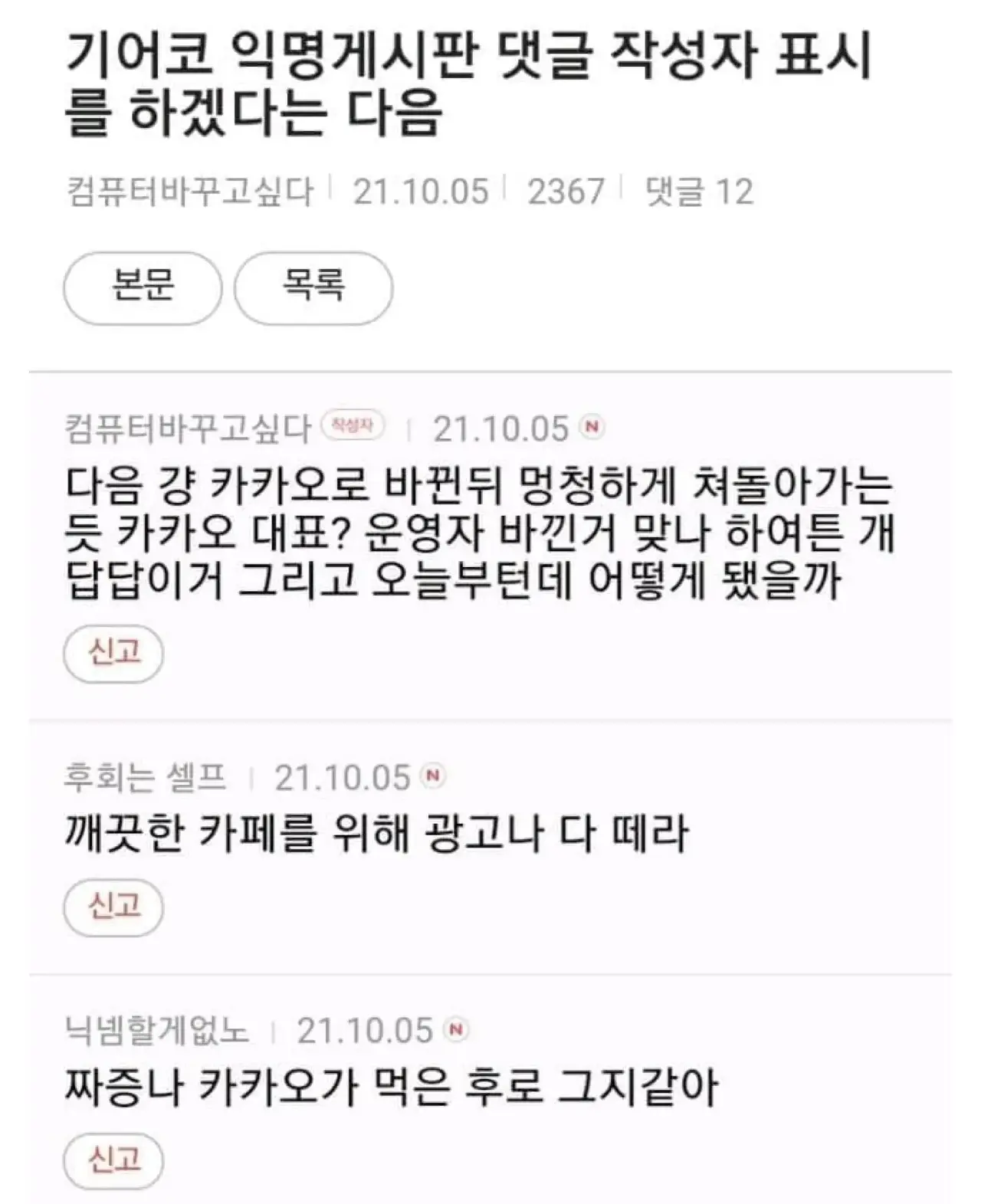 오늘 다음카페 기능 업데이트 되면서 기존에는 똑같이 '익명'으로만 보이던 댓글 들 중에 글쓴이 당사자가 쓴 댓글은 옆에 '작성자' 마크가 보이게 업데이트 되었습니다.