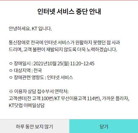 25일 오전 11시30분경 KT 유·무선 인터넷망에 데이터 전송이 뤄지지 않아 전국적인 통신 장애가 발생했던 일이 발생했습니다.