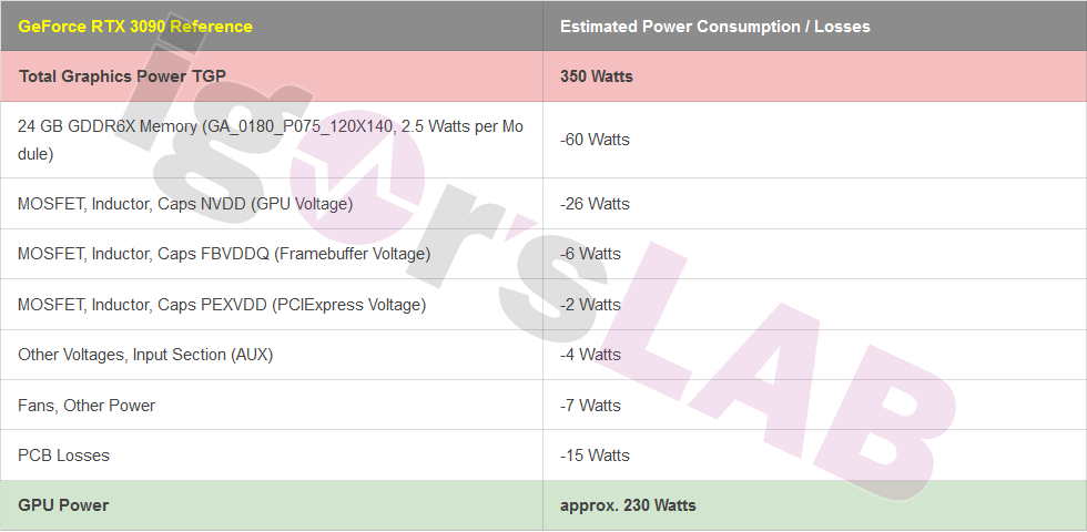 당시 저는 GeForce RTX 3080 및 이후 RTX 3090에 대한 제 추정치로 여러 포럼에서 공격을 받았지만 이해 부족이 발생한 이유에 대해서는 언급하고 싶지 않습니다. 하지만 전력은 연료에서 나오며 결국 계산은 거의 와트에 맞았습니다. GA102가 포함된 구형 GeForce RTX 3090의 가장 중요한 구성 요소에 대한 (매우 단순화된) 요약을 다시 살펴보겠습니다.