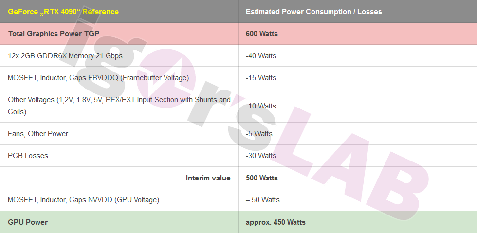 전력 소비를 추정하고 트랙을 보면 더 많은 위상이 더 많은 도체 트랙을 의미하기 때문에 회로 기판 손실이 거의 2배로 증가했다고 거의 가정할 수 있습니다. GPU 전압 변환기(NVVDD)가 3090Ti와 매우 유사하다면 약 90%의 효율을 보여야 하며, 이는 약 50와트에 해당합니다. 다시 말하지만, 이는 RTX 3090이 열로 변환한 것의 약 2배이며 GPU에 약 450와트를 남깁니다. 이와 관련하여 AD102는 전력을 2배 미만으로 약간만 소비합니다.