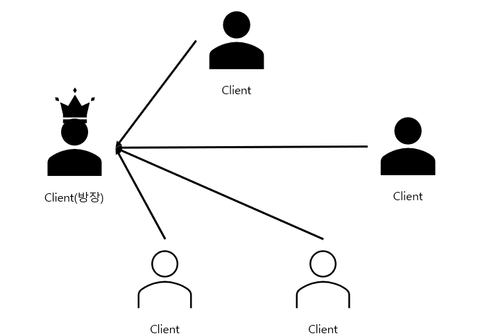 | 구조 | 방장을 정해서 방장에게 커넥트하여 방장이 모든 커넥션을 가지고 있는 형태. | 서로가 서로에게 커넥션 하는 형태. |