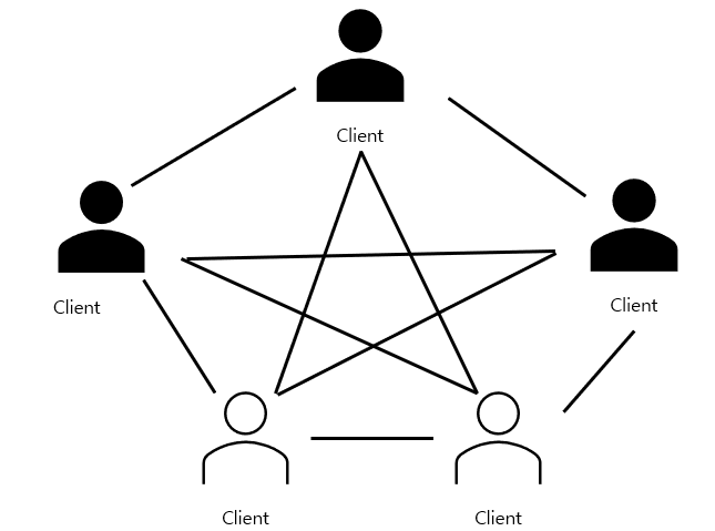 풀리 커넥션(Fully Connection)방식은 각 클라이언트가 모두 다른 클라이언트에 대한 모든 커넥션을 가지고 있습니다.