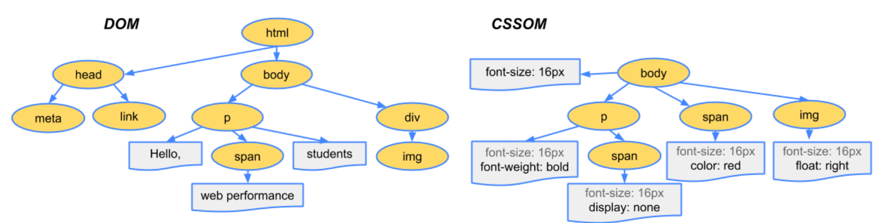 파싱 중 HTML에 CSS가 포함되어 있다면 CSSOM(CSS Object Model) Tree 구성 작업도 함께 진행하게 됩니다.