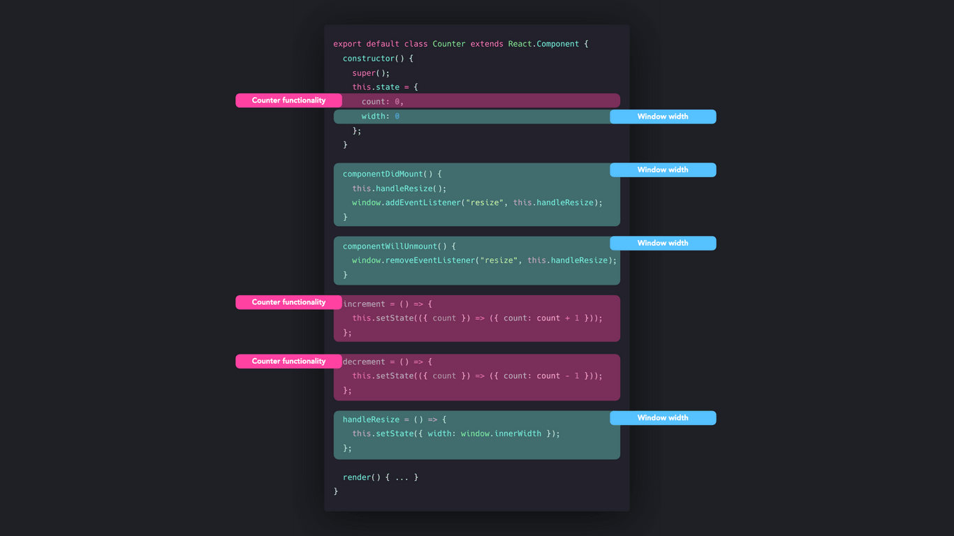 컴포넌트 내의 로직들은 서로 얽히고 분리하기 점점 더 어려워져 개발자가 클래스 컴포넌트 안에서 무슨 로직이 동작하는지 알기 어렵게 만들죠. 결국 디버깅과 성능 최적화를 어렵게 만듭니다.