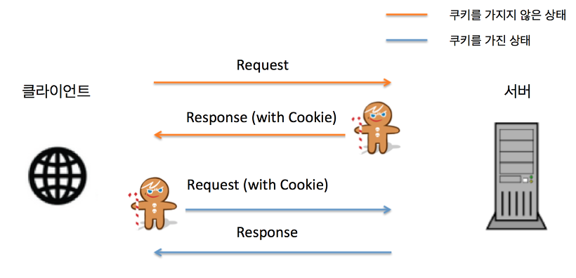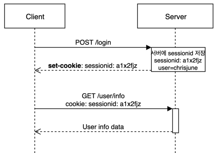 - 서버는 클라이언트의 로그인 요청의 유효성을 확인하고(아이디와 비밀번호 검사) 응답헤더에 set-cookie: user=chrisjune 를 추가하여 응답합니다.