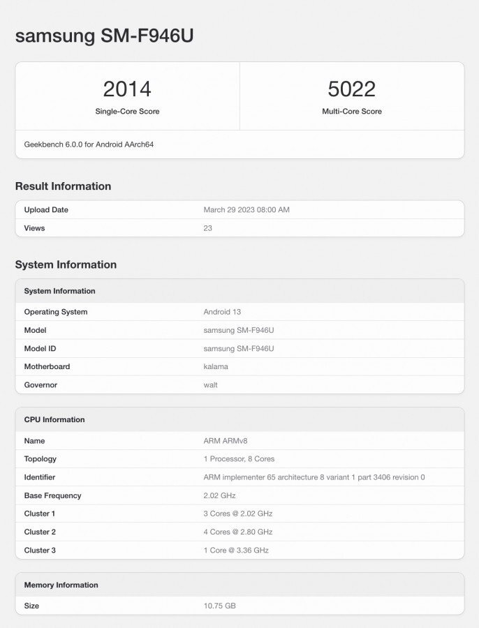 삼성 갤럭시 Z 폴드 5(SM-F946U)는 싱글 코어 테스트에서 2,030점, 멀티 코어에서 5,213점을 기록했습니다. 이 점수는 각각 1,500점과 4,900점대를 기록한 갤럭시 S23 시리즈 휴대폰보다 약간 높은 점수입니다. 테스트에 사용된 Z 폴드 5는 12GB RAM을 탑재하고 Android 13을 실행합니다.
