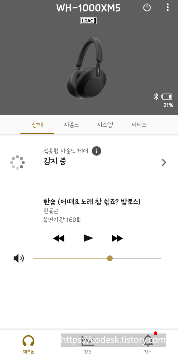 그리고 사운드 부분도 상당히 좋았는데 특히 저는 베이스와 같이 둥둥거리는 소리를 좋아하는데 이전 모델인 XM4에 비해 이 부분이 아쉽다는 평이 있었지만 체감하지 못했어요.