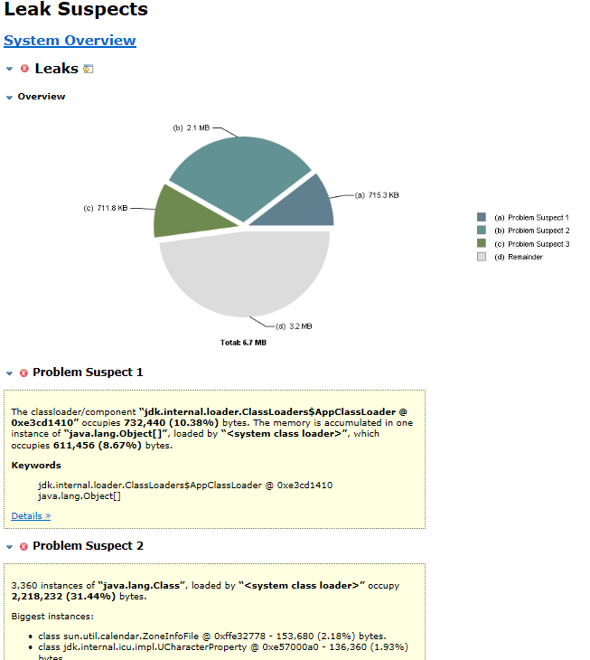 그 밑에 Problem Suspect부분은 메모리 누수의 유력한 용의자를 나타내주는 부분이고,
