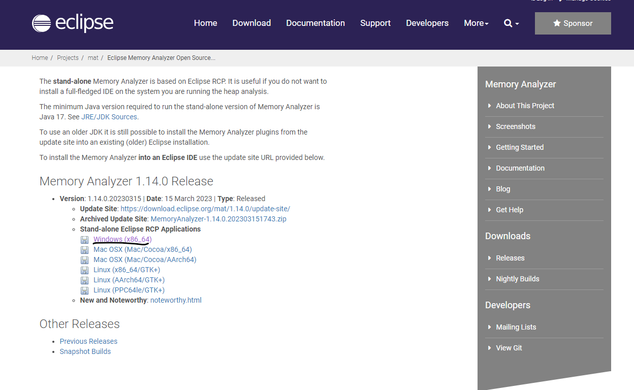 먼저 https://www.eclipse.org/mat/downloads.php 에 접속하여 개발 환경에 맞는 버전으로 설치하시면 됩니다.