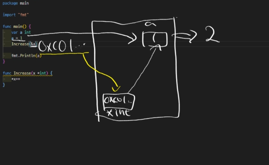 Increase()함수를 호출 할 때 a의 주소를 넘겼는데 이 주소값은 0xC01...이라고 가정했을 때 이 메모리 값이 x에 복사가 되는 것입니다.