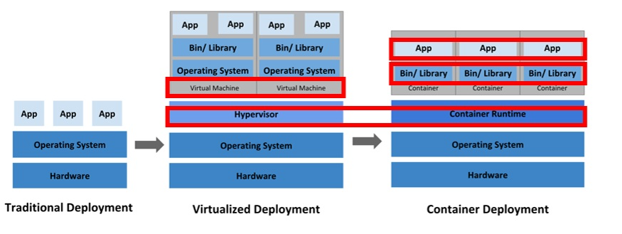 마지막으로 Container Deployment(컨테이너 중심의 배포)에 대해 살펴보자. 하이퍼바이저라는 부분이 Container Runtime으로 대체되었고, Virtual Machine이라고 된 부분은 Container로 대체가 되었다. 컨테이너는 가상머신과 달리 프로그램 구동을 위해서 OS를 매번 설치할 필요가 없기 때문에 그림에서 보는 것과 같이 OS는 하나만 사용한다.