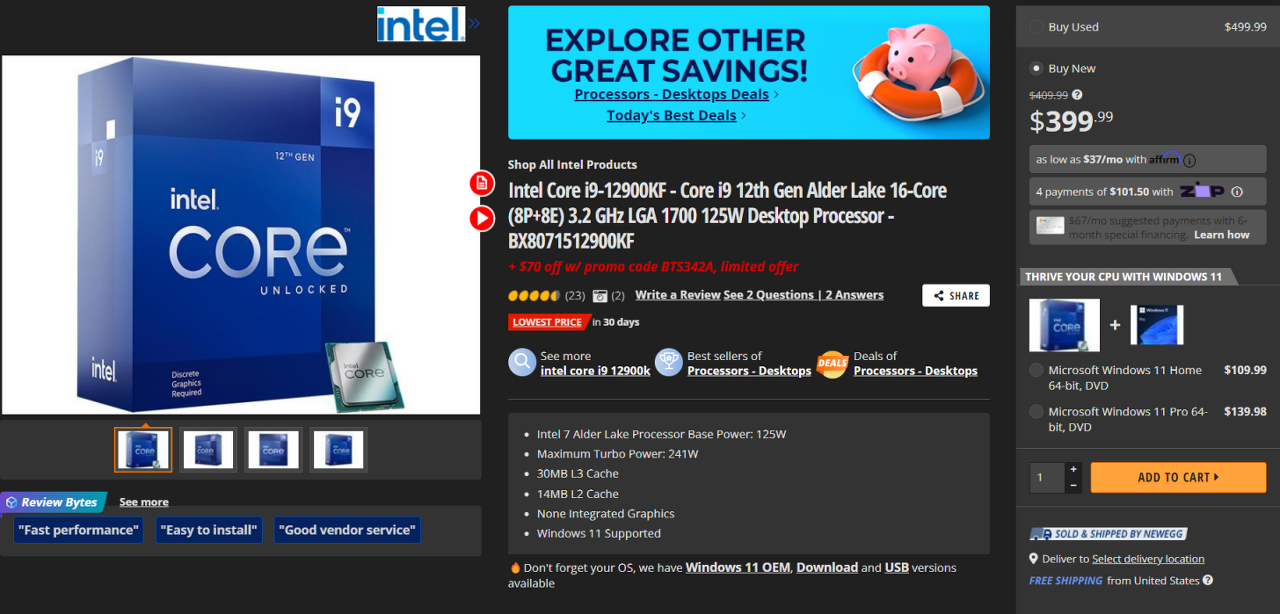 Core i9-12900KF 16코어 CPU - $329.99(Newegg US)