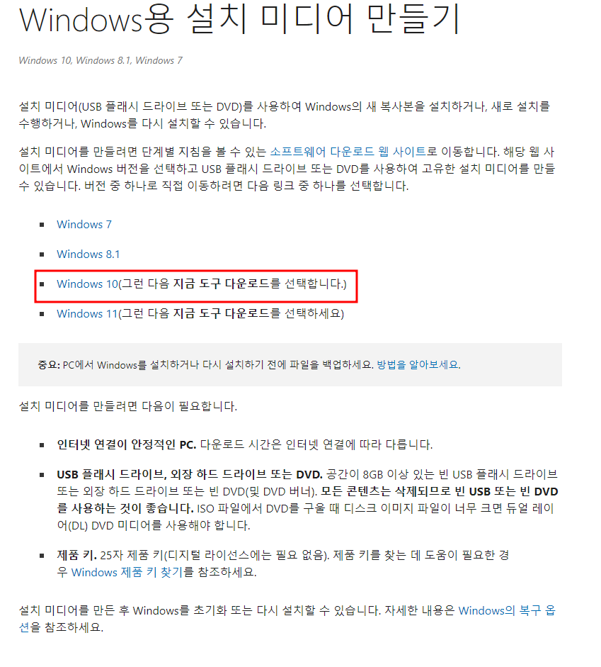 Windows용 설치 미디어 만들기 - Microsoft 지원