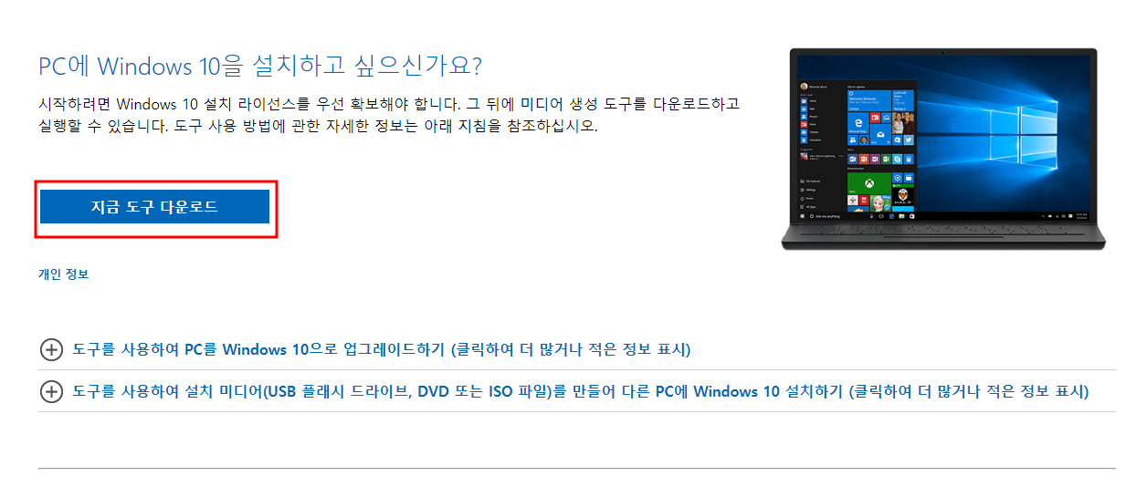 그래서 마소 홈페이지에 가서 윈도우 10 부팅 USB를 만들어 주었습니다. 방법은 간단합니다.