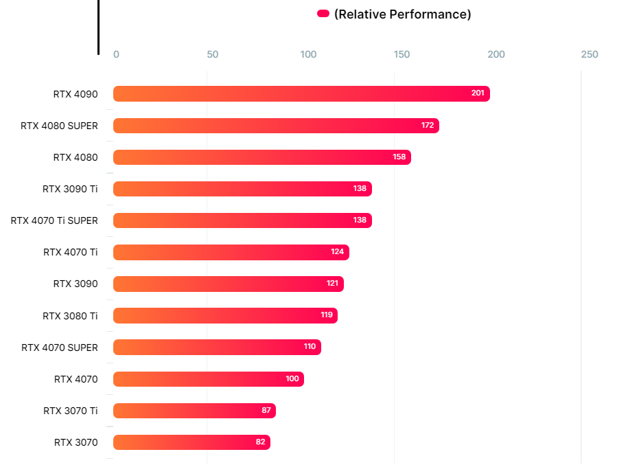저희가 수집할 수 있었던 정보에 따르면, 이 차트는 Non-DLSS(Frame-Gen) 성능을 기반으로 한 것이므로 실제 비교를 하고 있는 것입니다. 다음은 각 특정 그래픽 카드의 상대적인 성능 값입니다:
