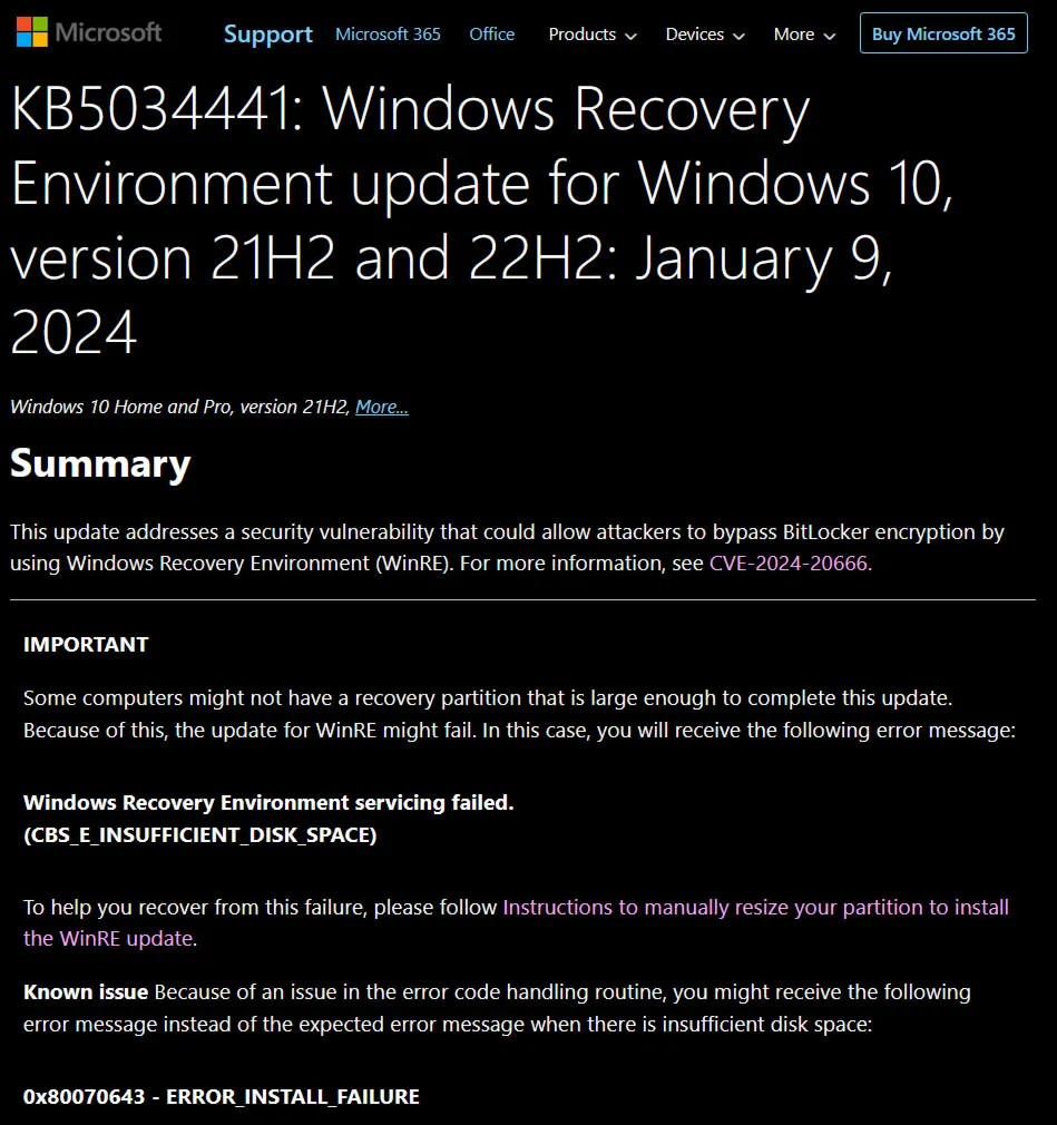 이 문제에 대한 권고 게시물에서 Microsoft는 KB5034441이 Windows 복구 환경(WinRE)을 패치하도록 설계되었다고 언급했습니다. 이 패치는 WinRE를 사용하여 파일에 액세스하는 것만으로 BitLocker 암호화를 우회할 수 있는 Windows 10 21H2 및 22H2의 보안 취약성을 해결합니다.