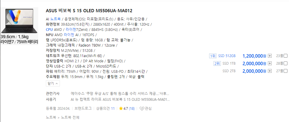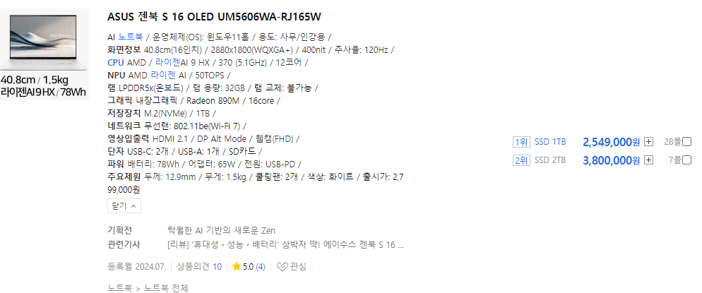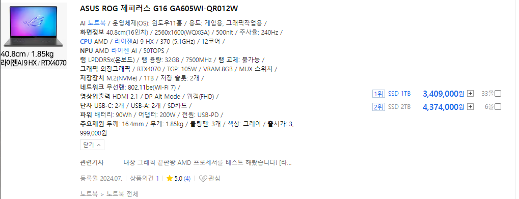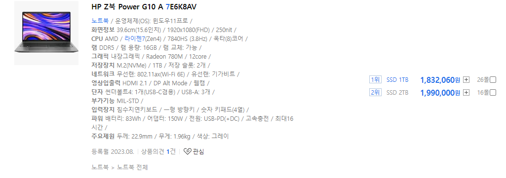 - 그래픽 카드 성능이 더 우수 - AMD Ryzen 7 7840U는 내장 그래픽 성능이 뛰어나, 경량 게임이나 그래픽 디자인과 같은 그래픽 집약적 작업에 적합합니다.