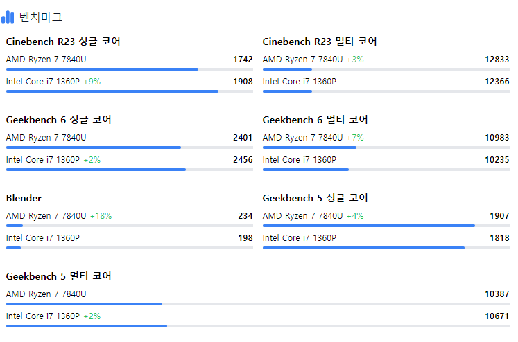 CPU 벤치 사이트를 통해 i7-1360P와 7840U를 비교해보도록 하겠습니다.