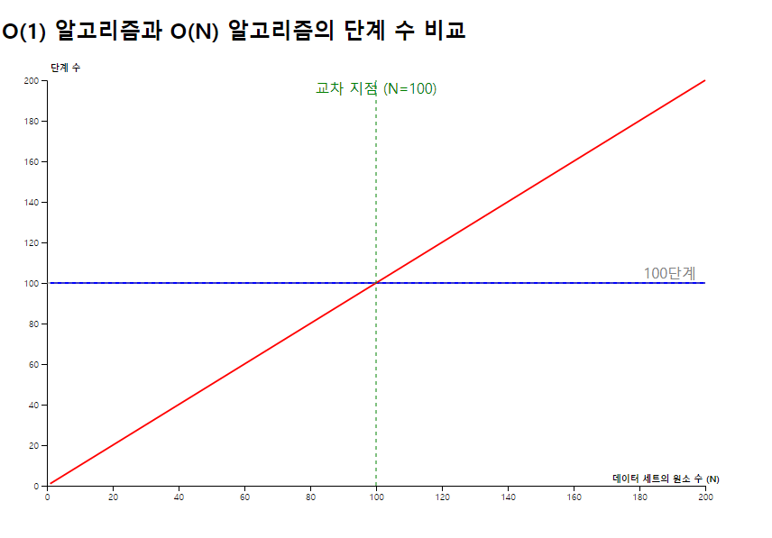 하지만 원소의 수가 정확히 100개일 때는 두 알고리즘의 단계 수가 동일하게 100단계가 됩니다. 원소가 100개를 초과하면 O(N) 알고리즘의 단계 수는 100단계를 초과하게 되므로, O(1) 알고리즘보다 덜 효율적이 되는데 이 지점이 바로 두 알고리즘의 성능이 교차하는 지점입니다.