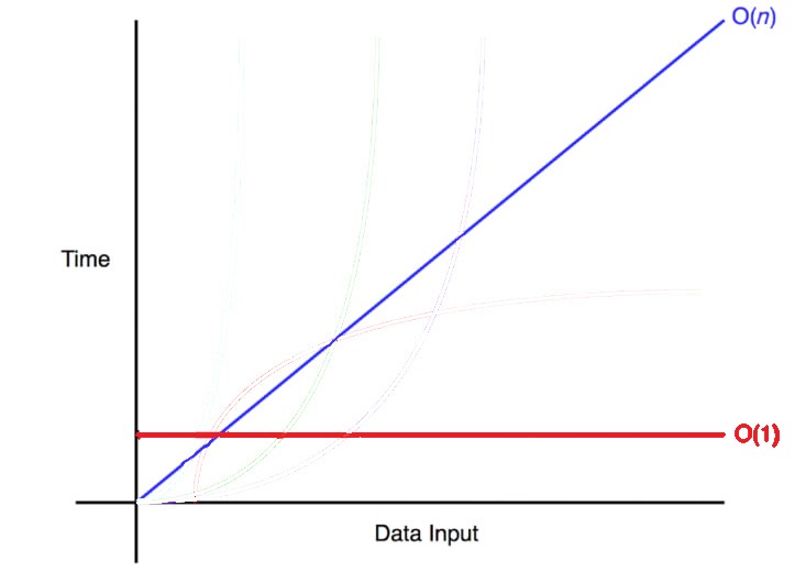 반면에 O(1)은 완벽한 수평선을 그리게 되는데 데이터의 증가나 감소에 영향 받지 않고 단계 수가 일정하다는 것을 의미합니다.
