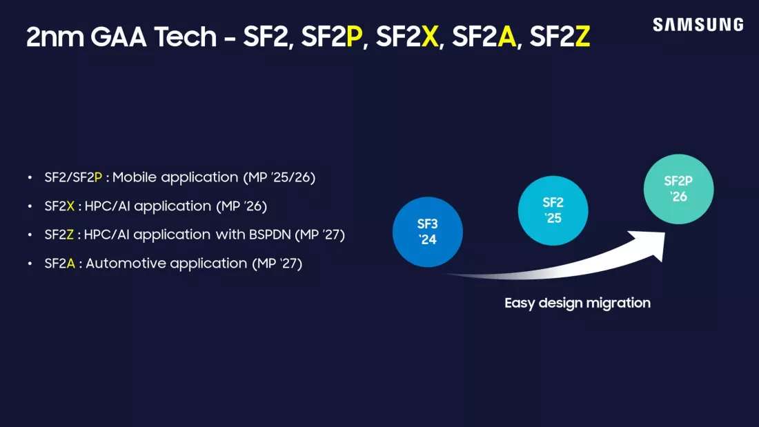 삼성은 모바일 기기용 SF2 및 SF2P 노드를 판매하고 있지만, SF2X 및 SF2Z의 타깃 고객은 고성능 컴퓨팅(HPC)입니다. 한편, 마지막 2nm 노드는 2027년에 자동차 애플리케이션에 출시될 예정입니다. 이번에 공개된 또 다른 새로운 노드는 2025년 대량 생산에 들어가는 4nm SF4U로, 광학 수축을 사용해 PPA를 향상시킵니다.