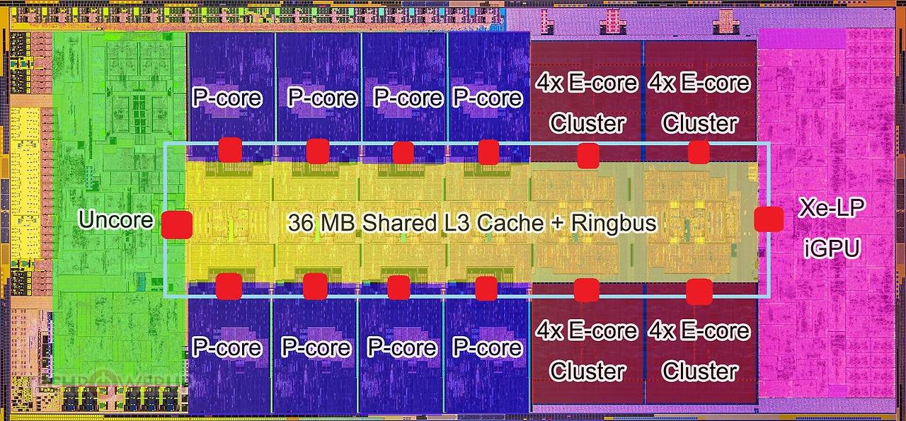 하이브리드 CPU 코어를 구현하는 인텔의 첫 3세대 클라이언트 프로세서인 '앨더 레이크', '랩터 레이크', '메테오 레이크'는 링버스를 따라 배열되어 L3 캐시를 공유합니다. 이렇게 하면 일반적으로 더 큰 P코어는 다이의 한 영역에, E코어 클러스터는 다른 영역에 배치됩니다. 양방향 링버스의 관점에서 링 스톱은 아래의 "랩터 레이크" 다이 샷에서 볼 수 있듯이 절반의 P코어, 절반의 E코어 클러스터, iGPU, 나머지 절반의 E코어, 나머지 절반의 P코어, 언코어의 순서를 따르게 됩니다. 인텔은 "애로우 레이크-S"에서 P코어와 E코어 클러스터를 재배치할 계획입니다.