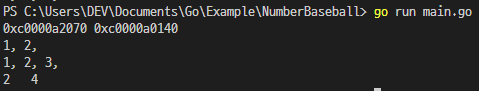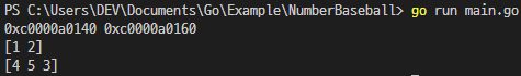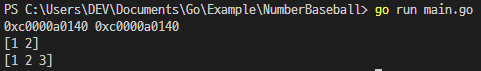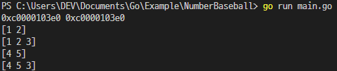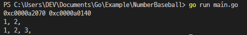 처음에 a라는 슬라이스를 만들어 1과 2로 초기화를 시켜주고, b라는 슬라이스는 a에 3을 추가한 슬라이스 입니다.